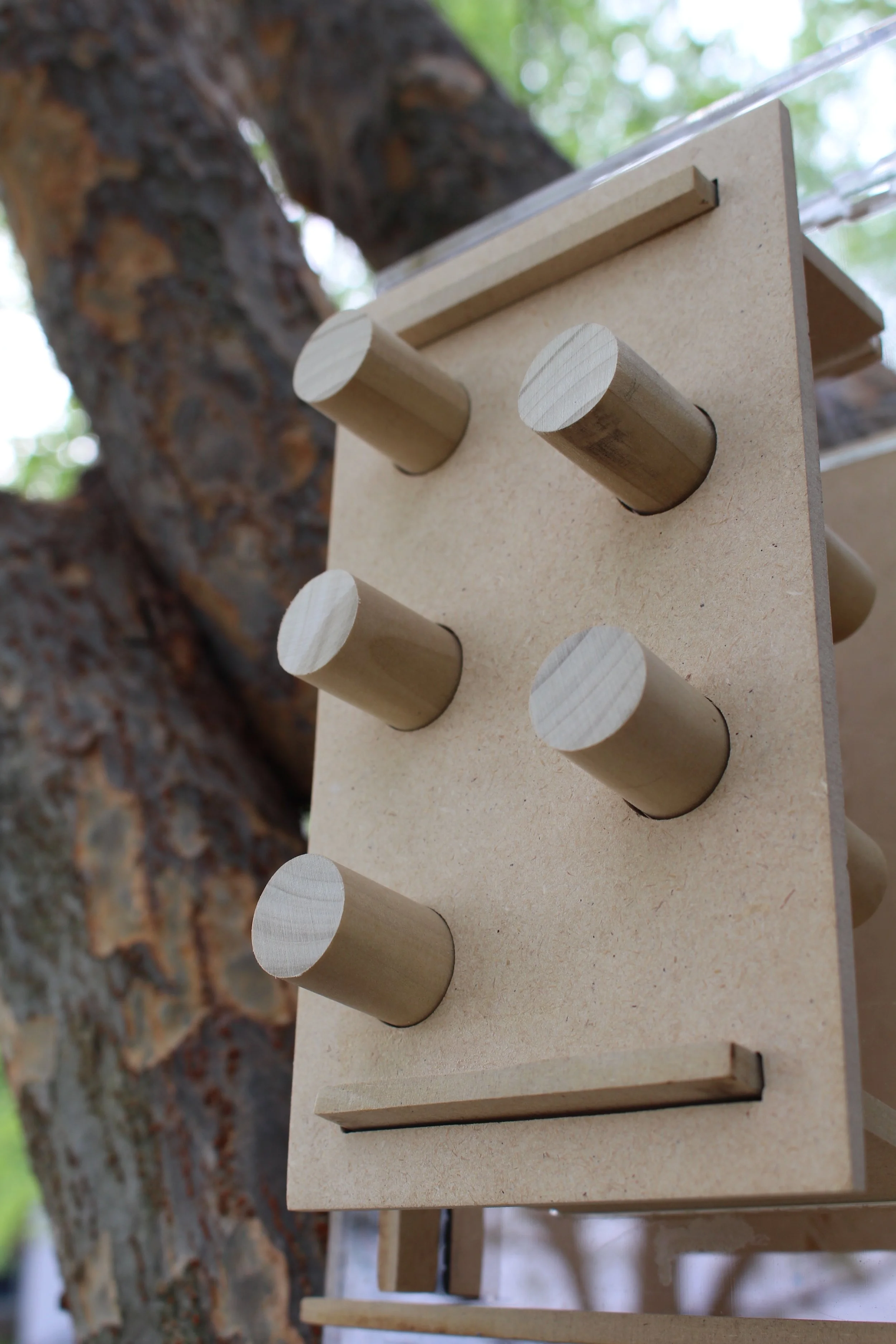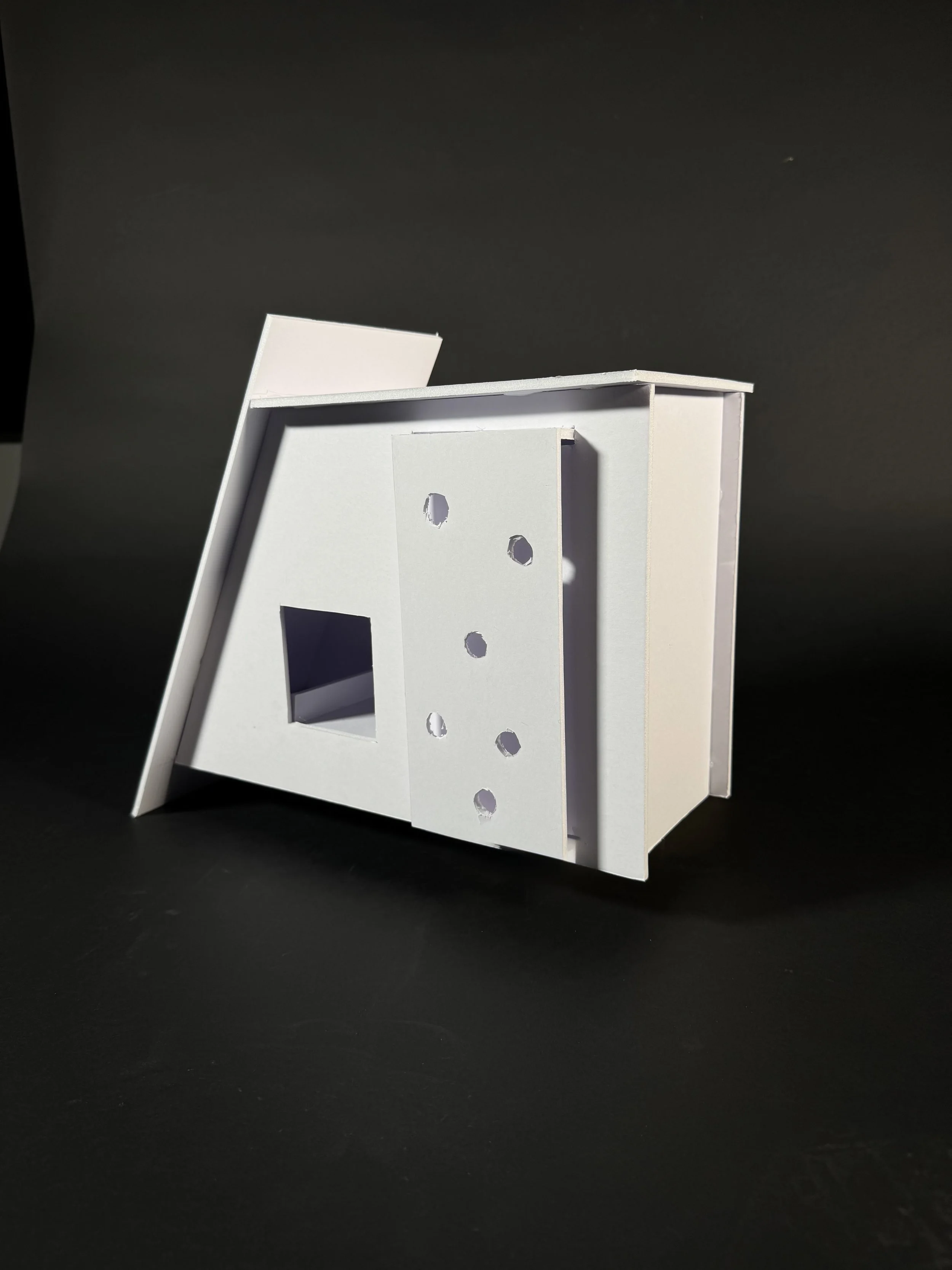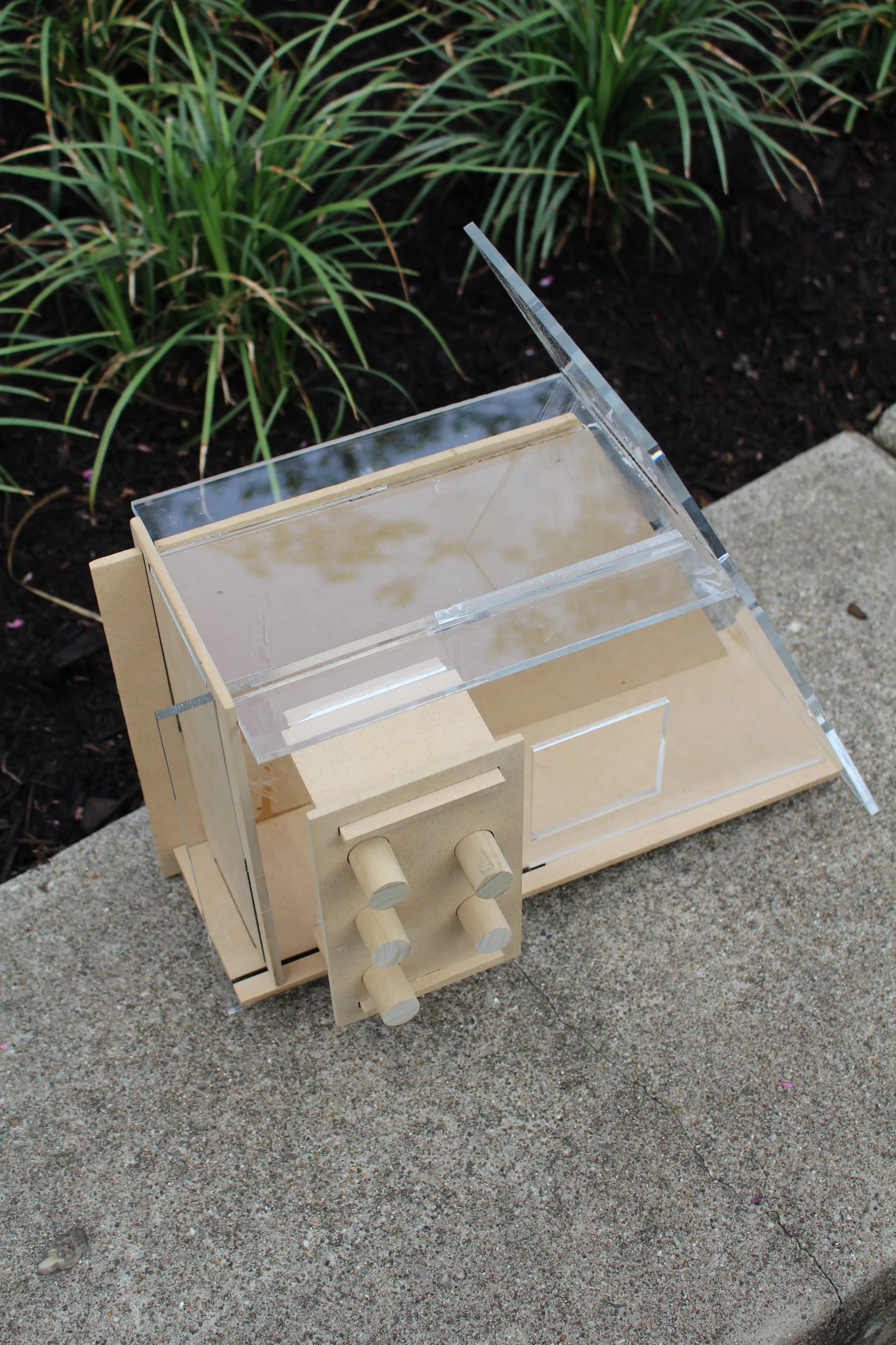 Design a fully slot-jointed birdhouse with no hardware so that it can be taken apart and easily stored. When disassembled, the birdhouse is able to be stored completely flat to save space. The use of individual pieces allow old or broken pieces to be easily replaced rather than purchasing a whole new birdhouse.