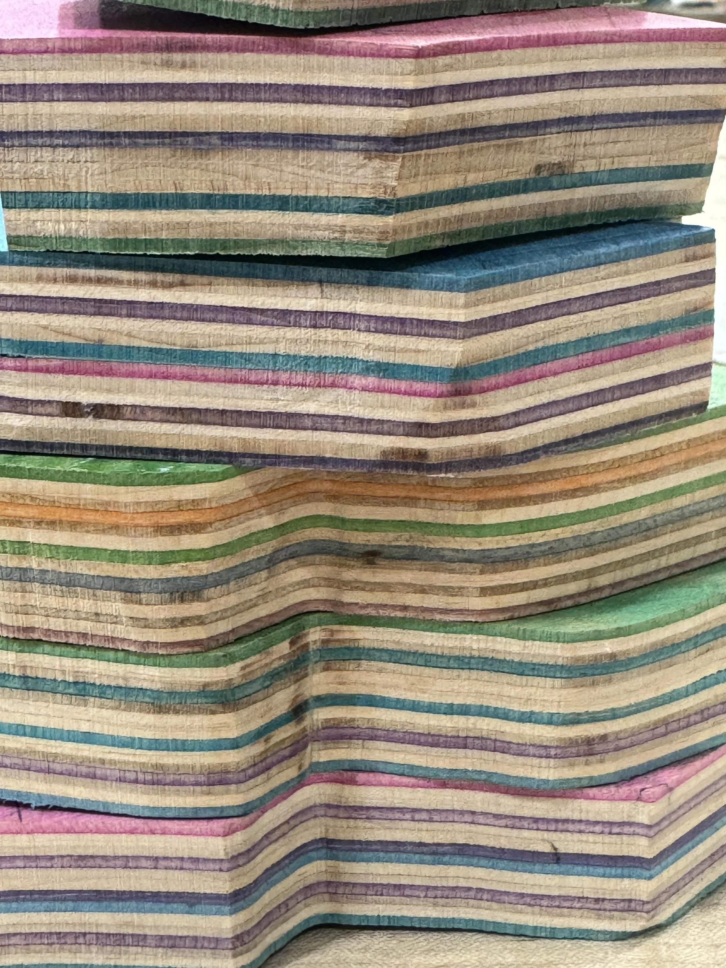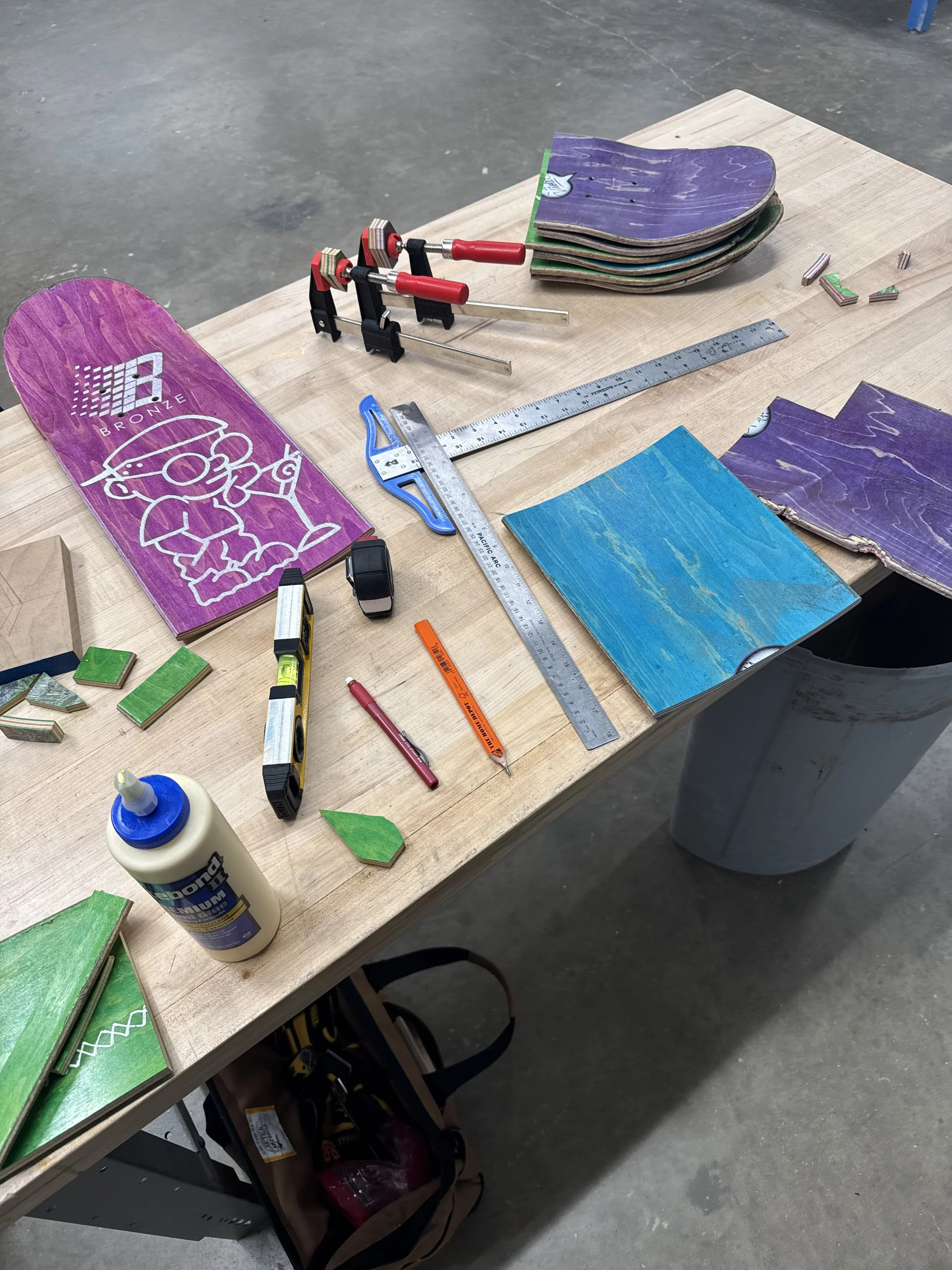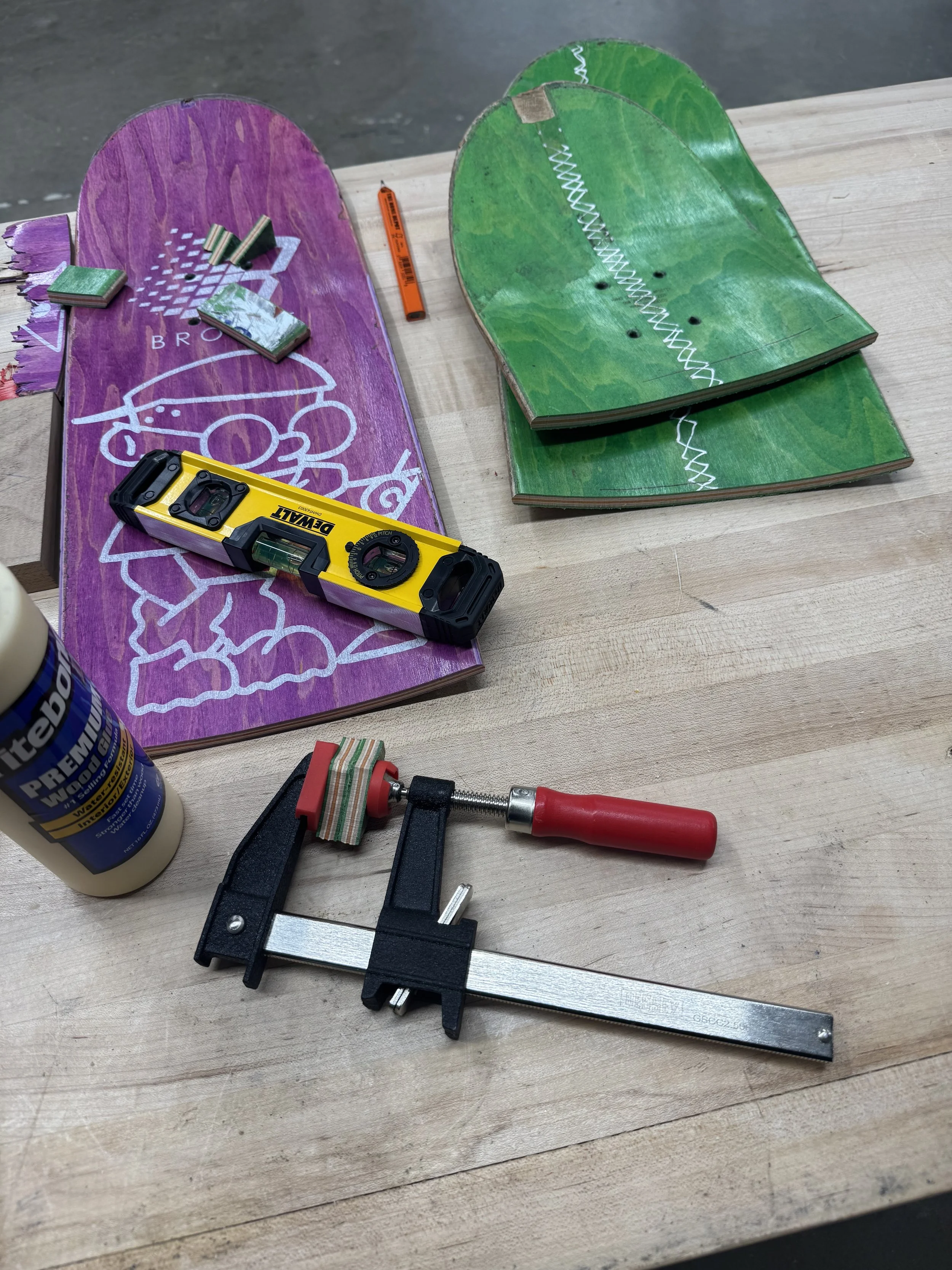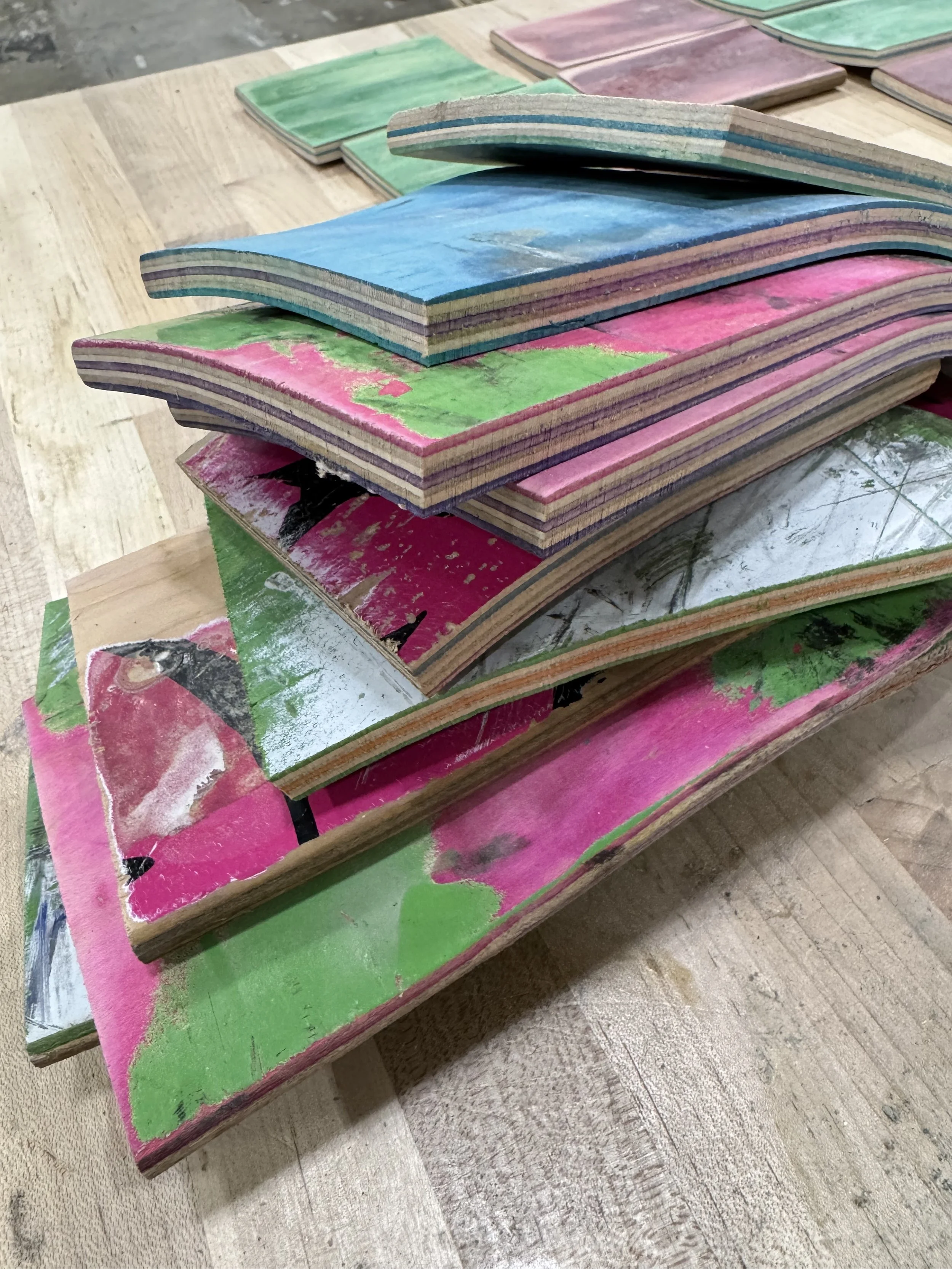 Plies of colored wood are layered, glued, and compressed together to create a skateboard deck