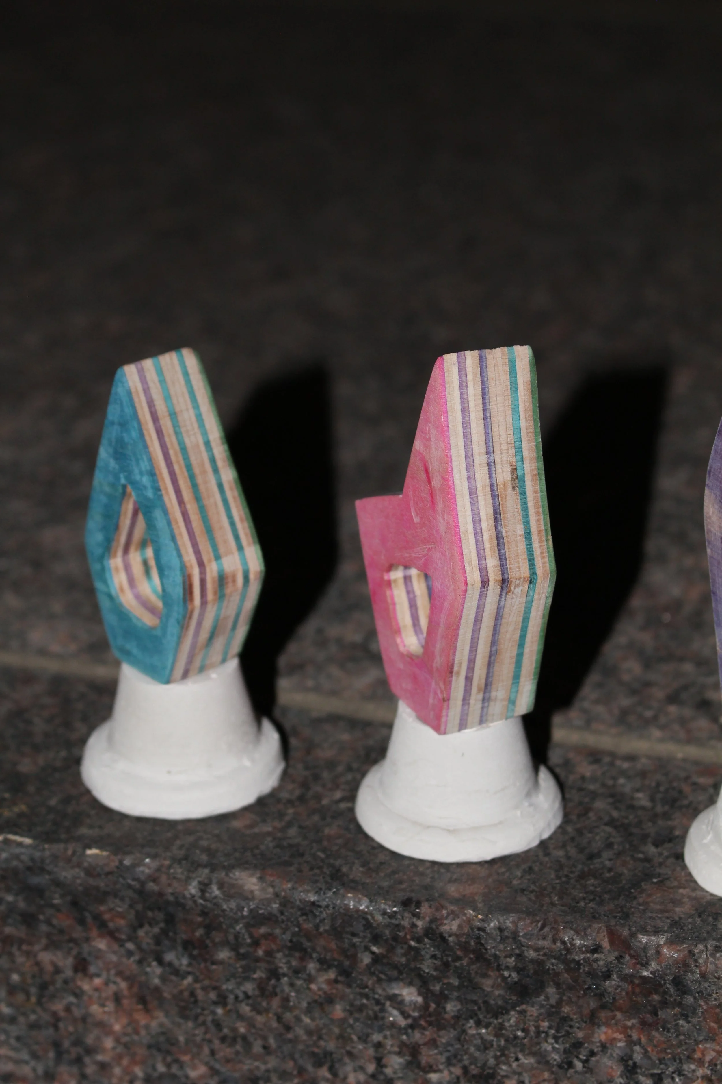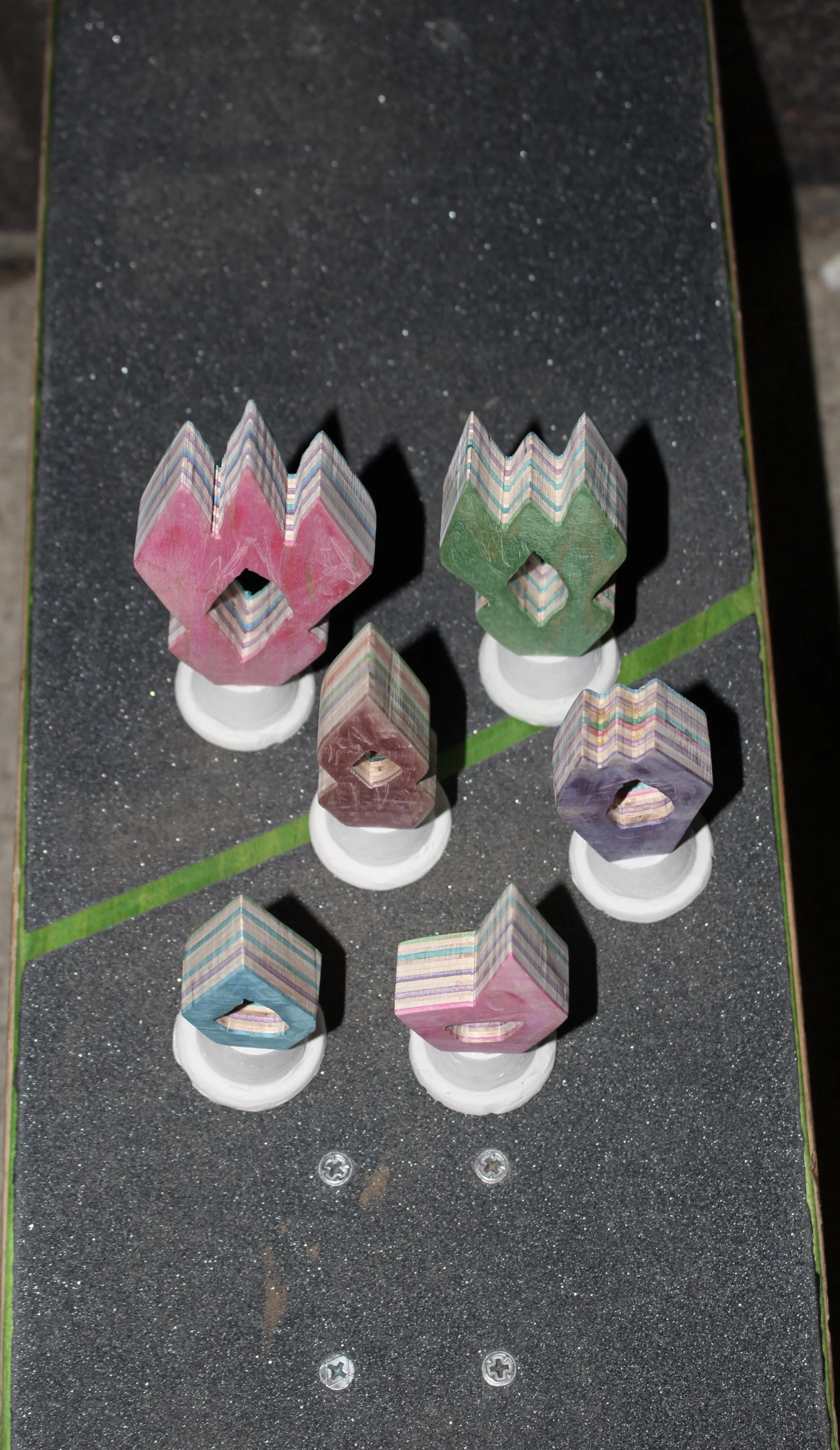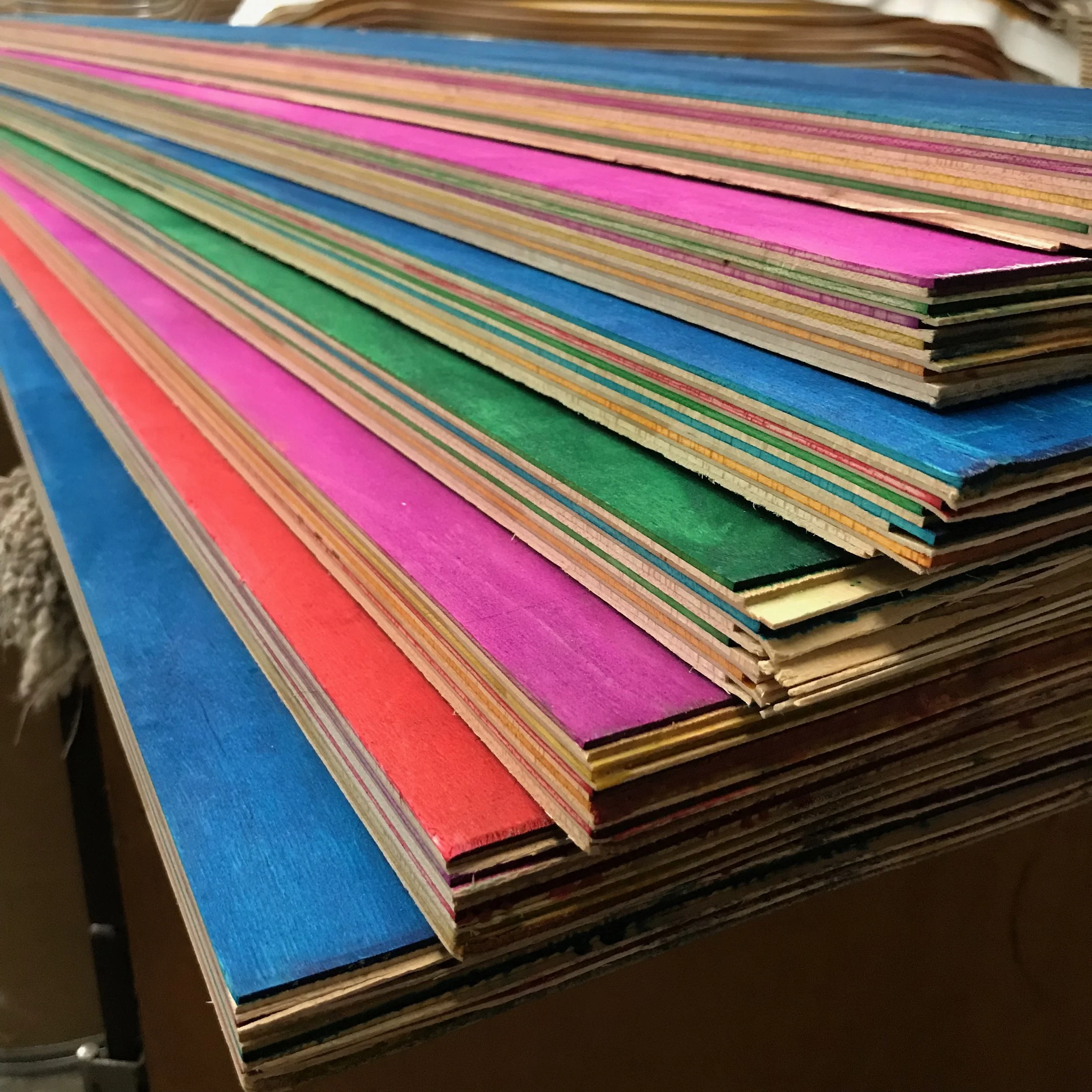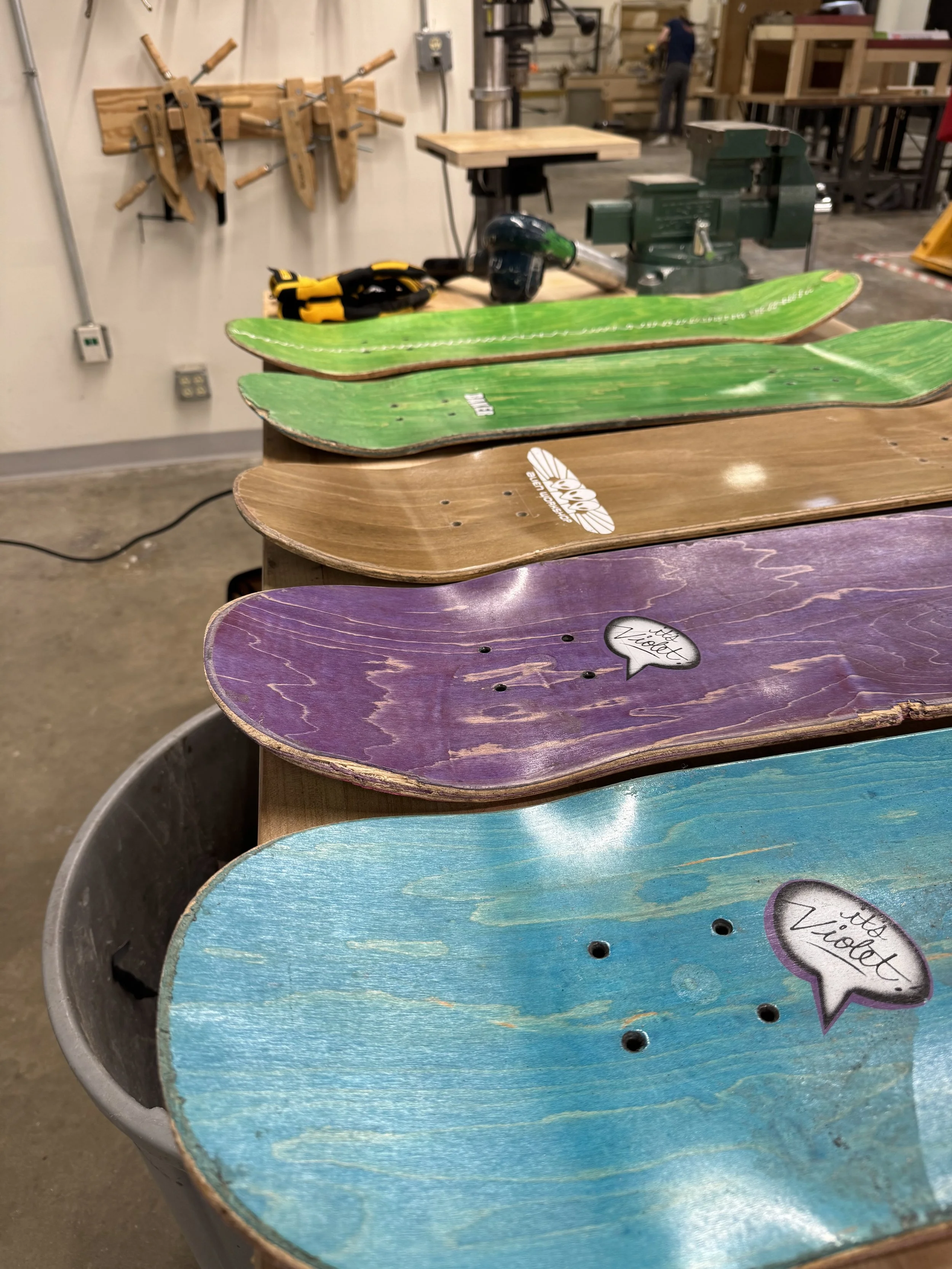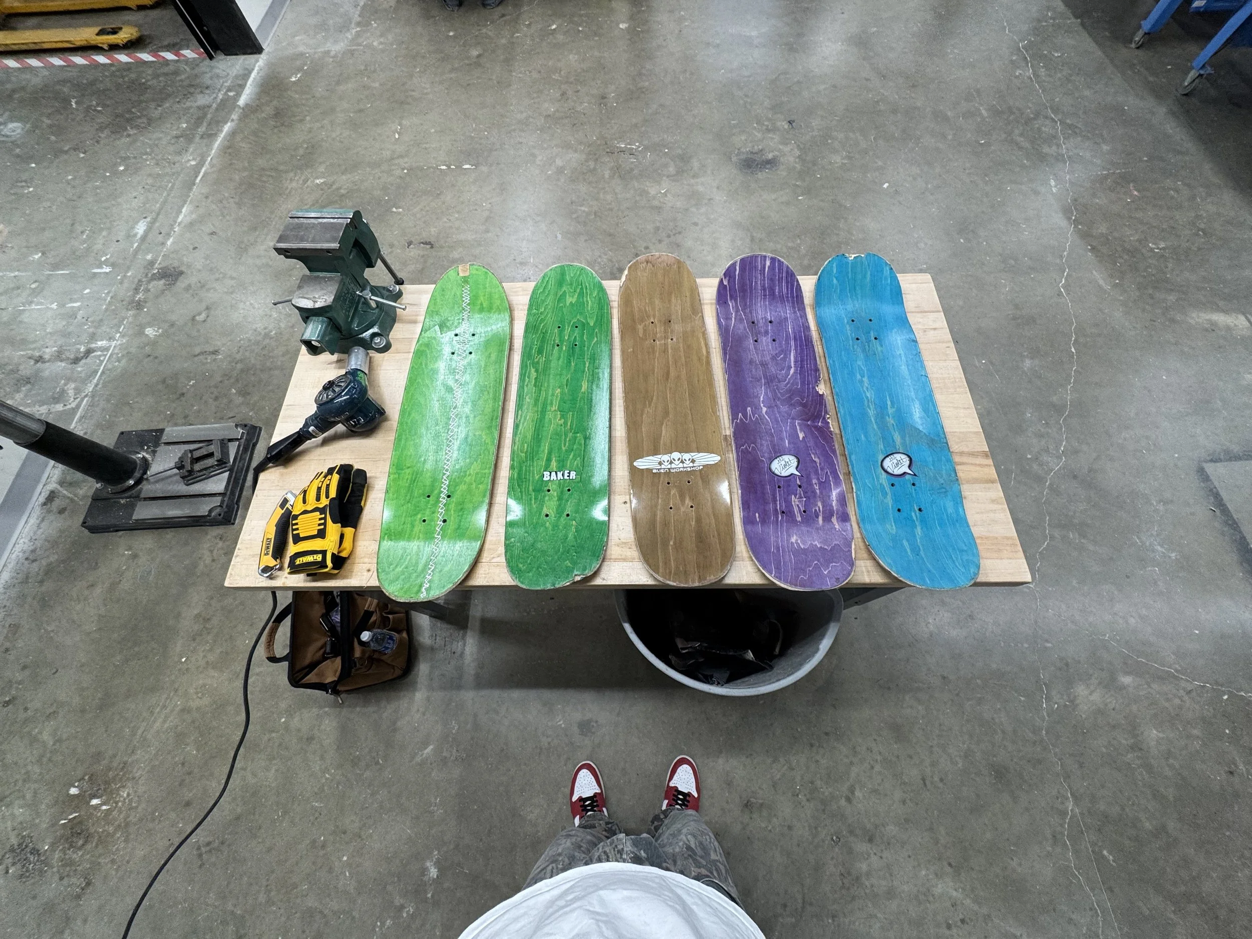 Plies of colored wood are layered, glued, and compressed together to create a skateboard deck