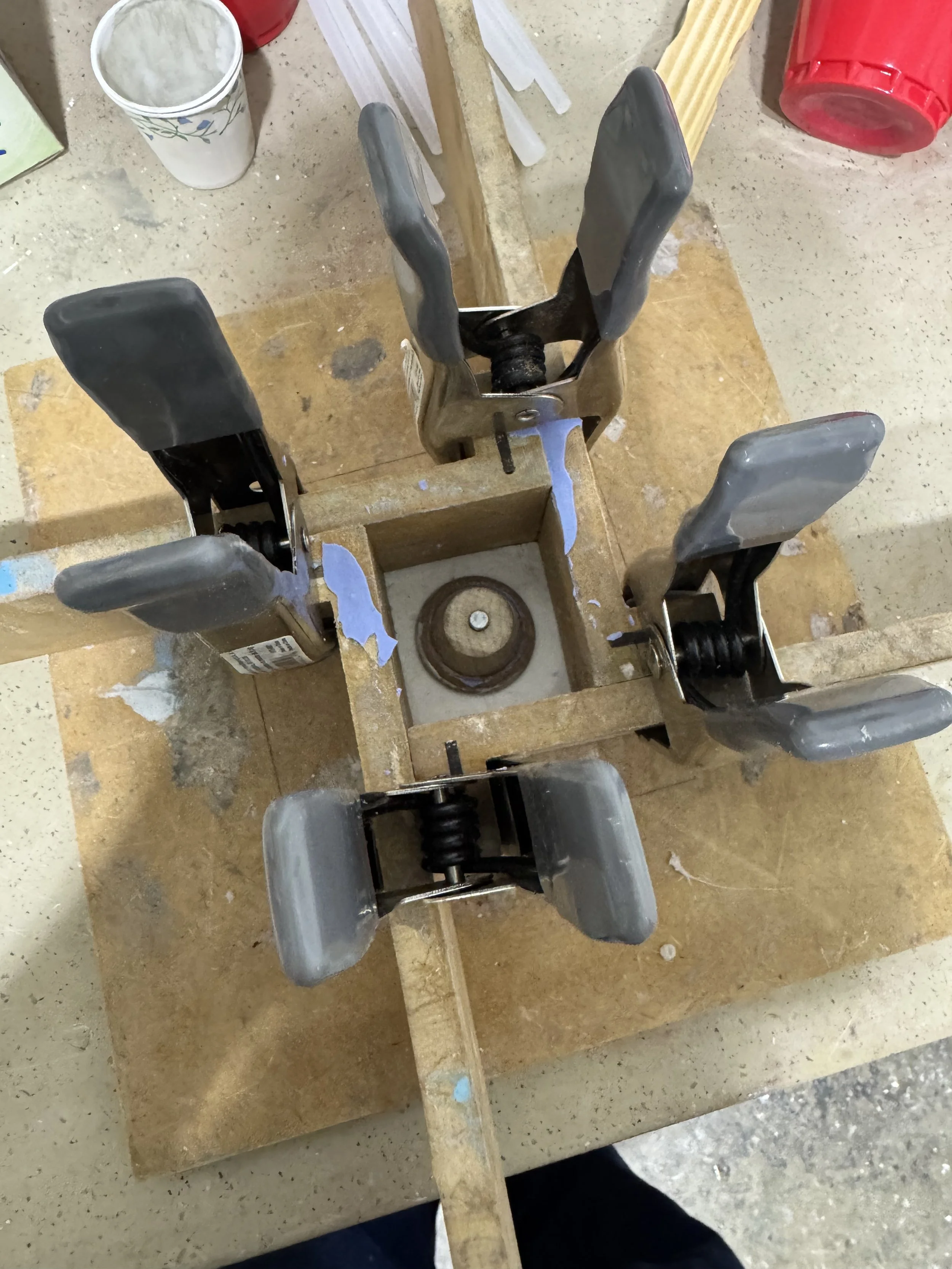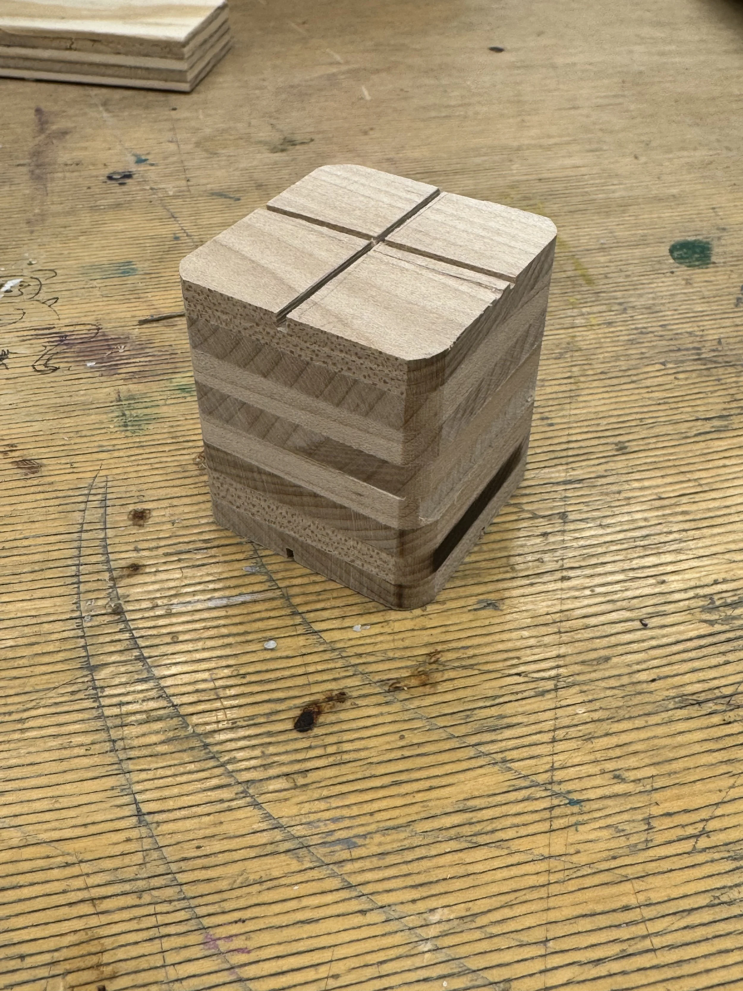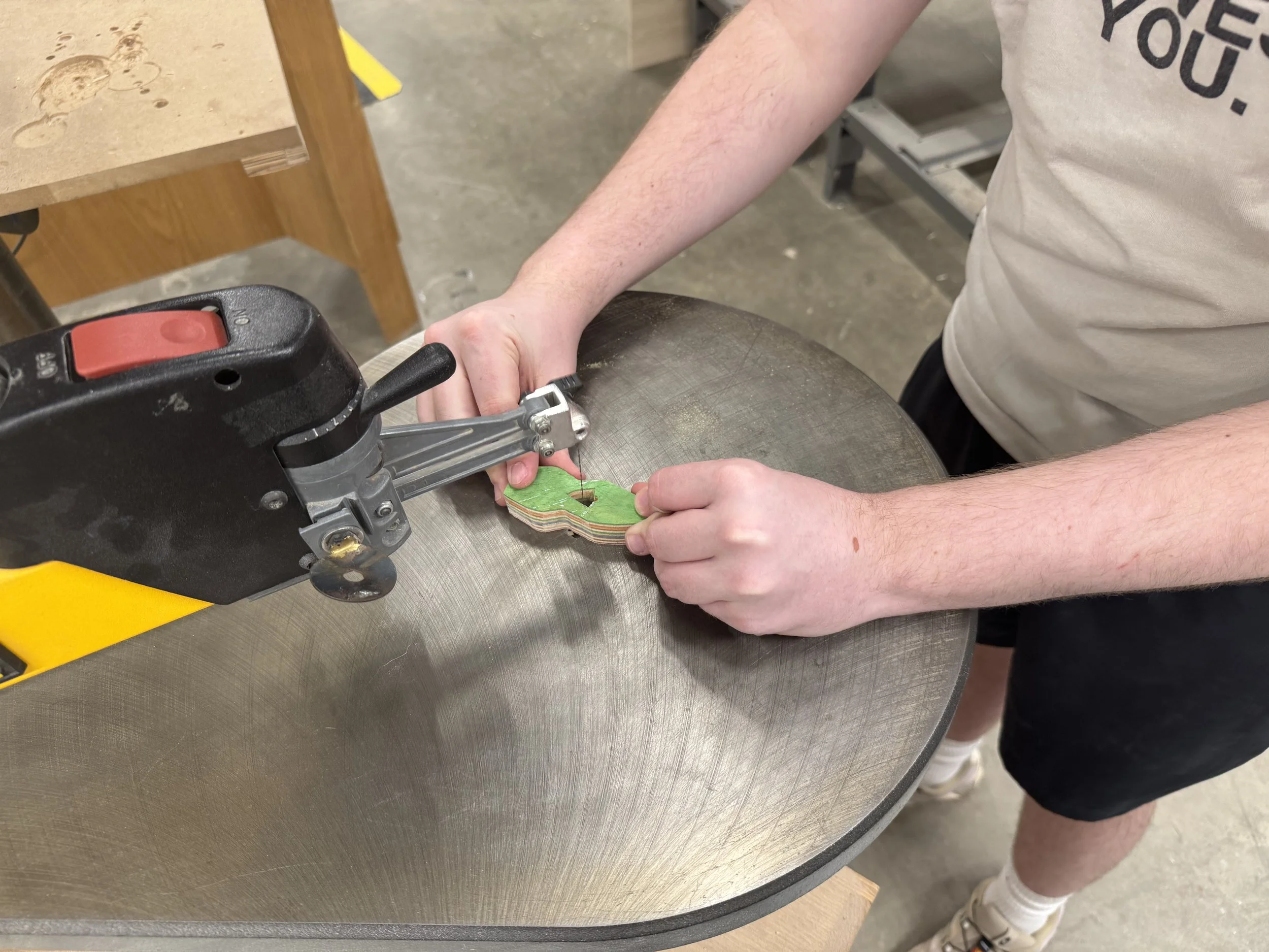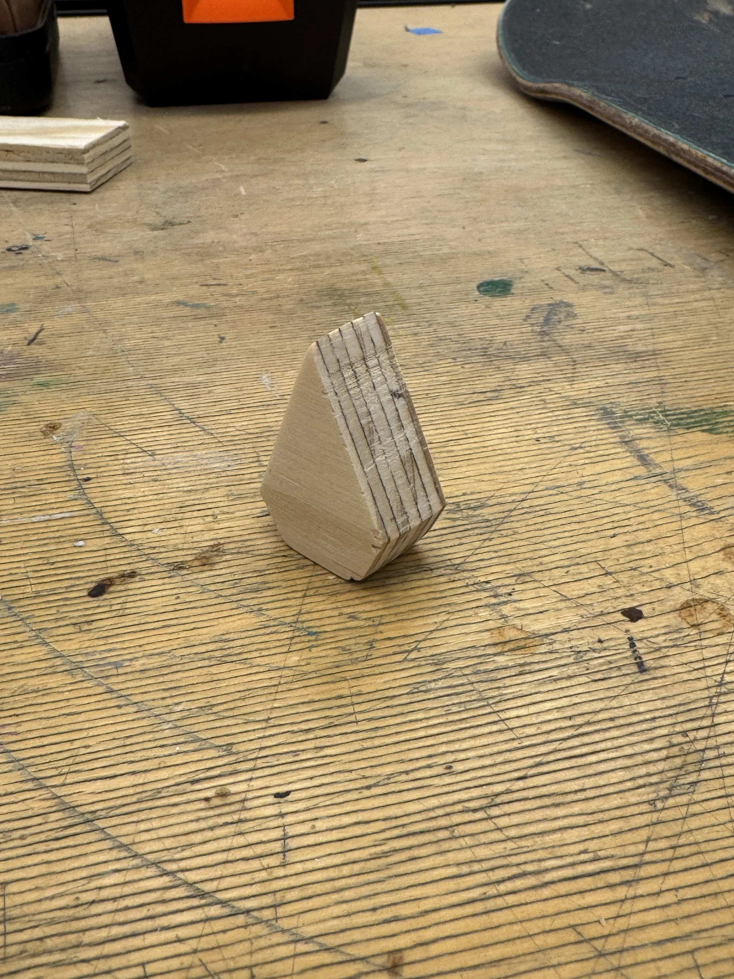 Plies of colored wood are layered, glued, and compressed together to create a skateboard deck