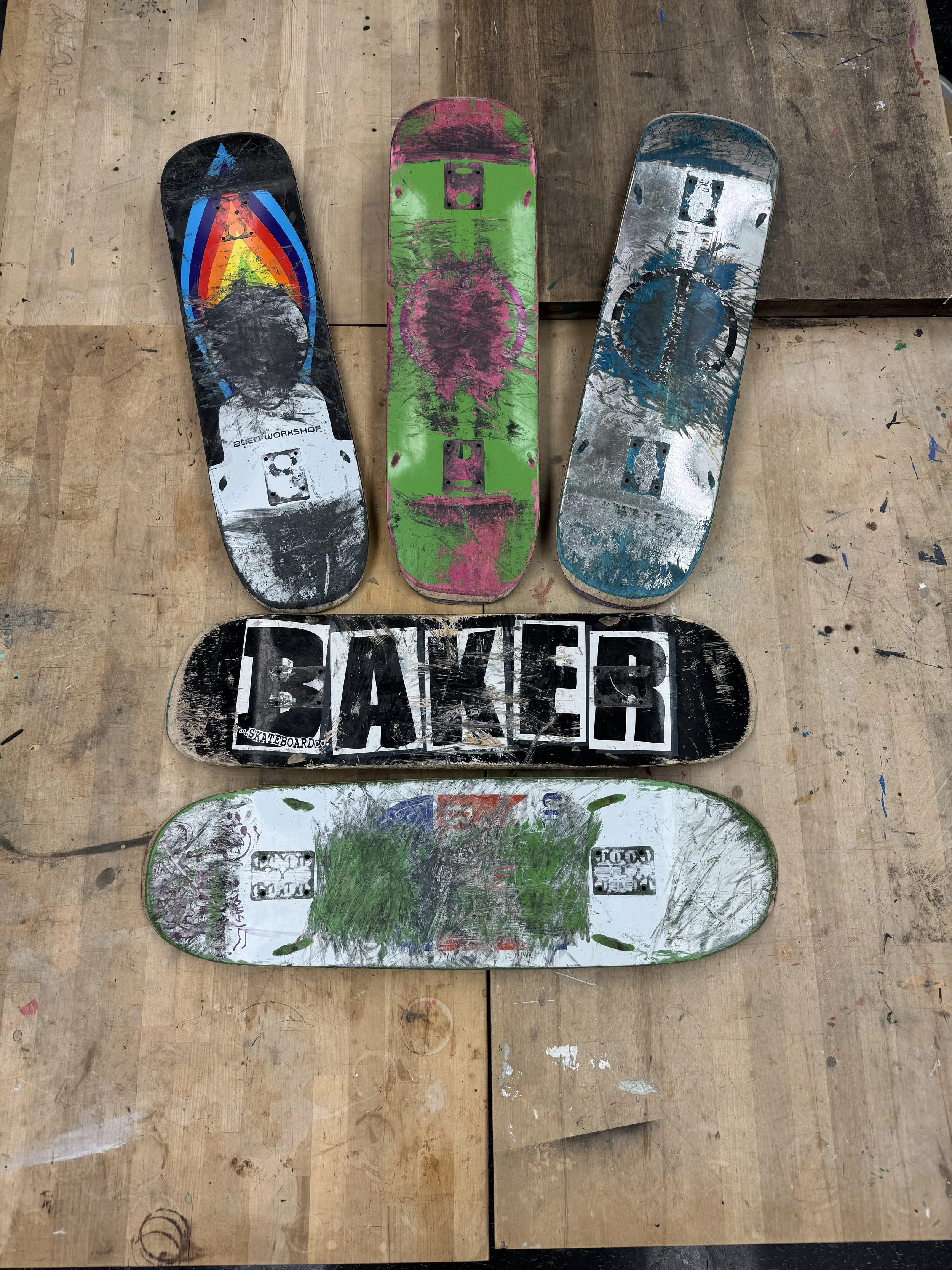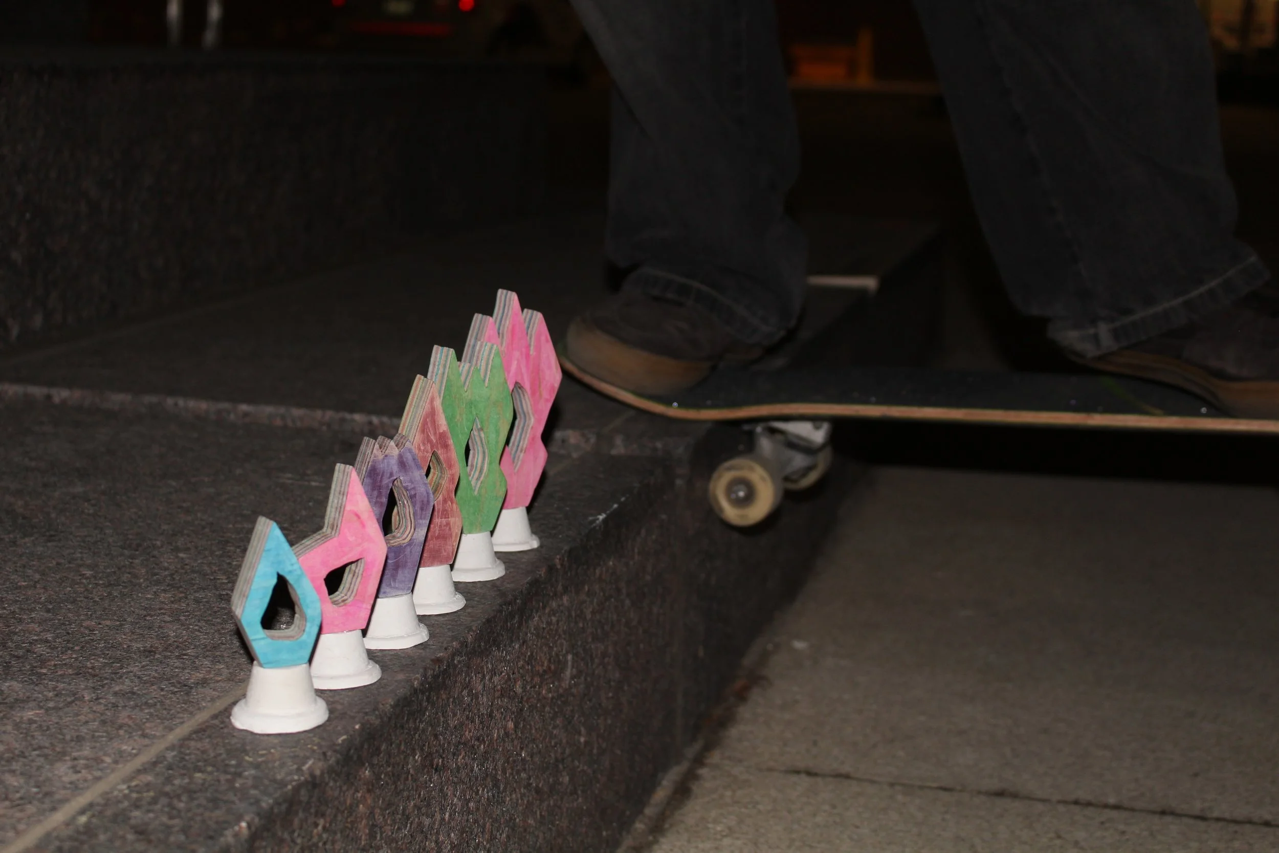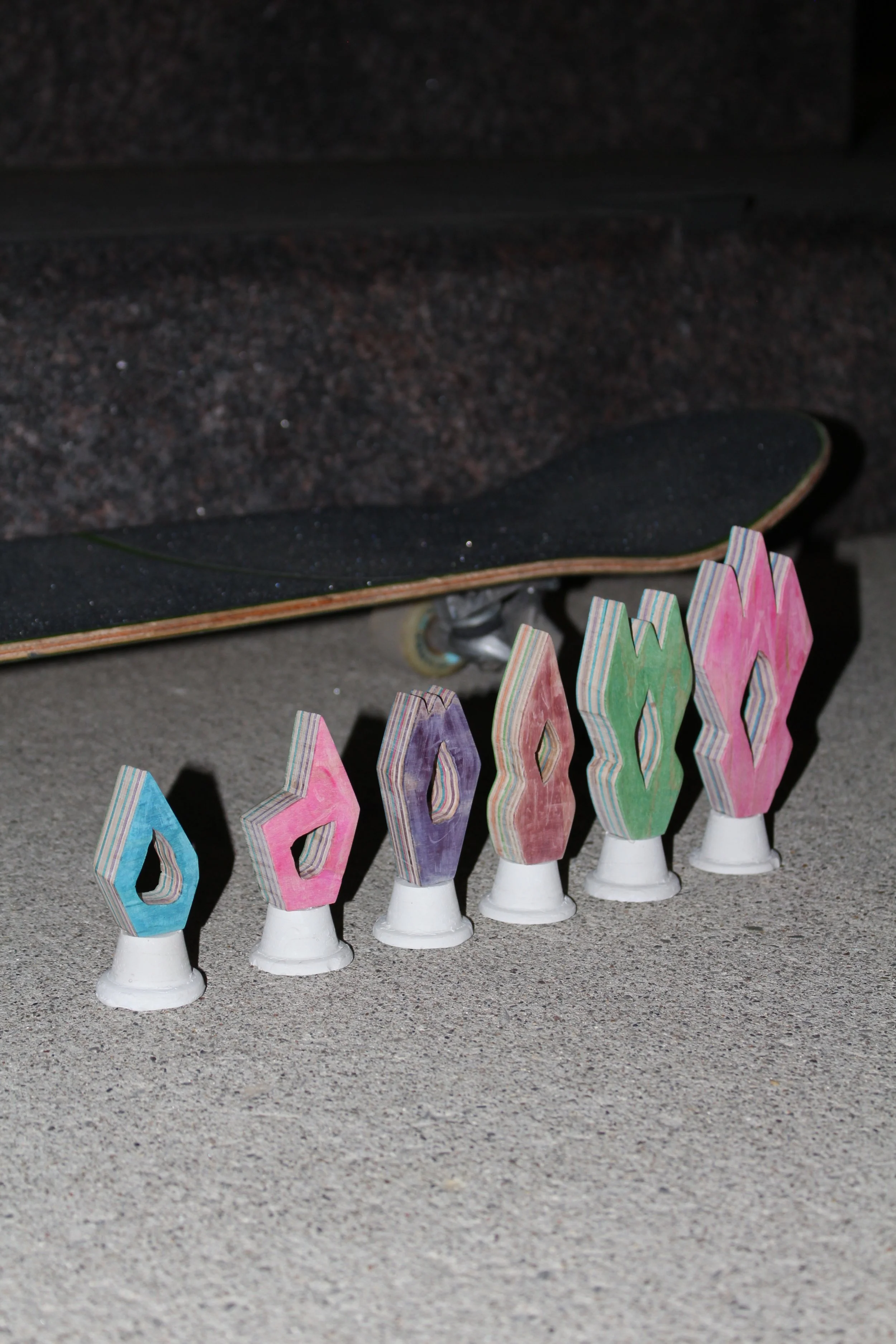 Forms took inspiration from snapped or broken skateboards while also paying homage to elements of classic skateboarding logos